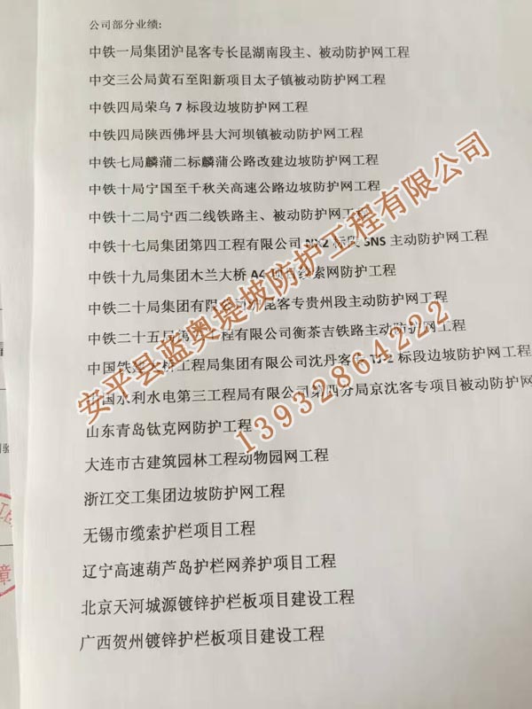 全部各地的客戶朋友們打進(jìn)電話會咨詢一下邊坡防護(hù)網(wǎng)產(chǎn)品的問題,產(chǎn)品了解清楚后有的朋友會考察一下公司情況。這樣的客戶朋友我們是非常尊重的,了解供貨方公司實(shí)力這是最自己負(fù)責(zé)對工程負(fù)責(zé)。因此我們會提供我公司的相關(guān)資質(zhì)、產(chǎn)品質(zhì)量檢測報(bào)告、進(jìn)場施工證明等。其實(shí)可以通過公司的工程業(yè)績(承接的工程項(xiàng)目)來證明公司實(shí)力。有些客戶會來我公司考察,為了客戶更方便的了解我們之前做過的一些項(xiàng)目,我們將最近3年施工過的邊坡防護(hù)網(wǎng)工程業(yè)績做了一下統(tǒng)計(jì),并打印出來。